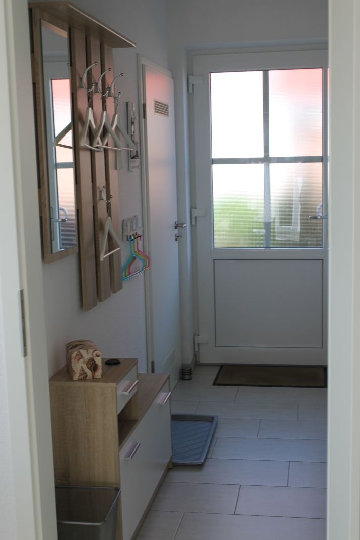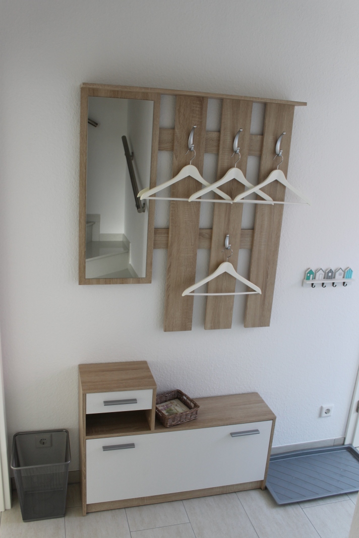Eine Kindergarderobe befindet sich direkt daneben über dem Schuhbrett. Sollten Sie Ihre Hausschuhe vergessen haben, liegen im Flur Filzpantoffeln in verschiedenen Größen für Sie bereit.