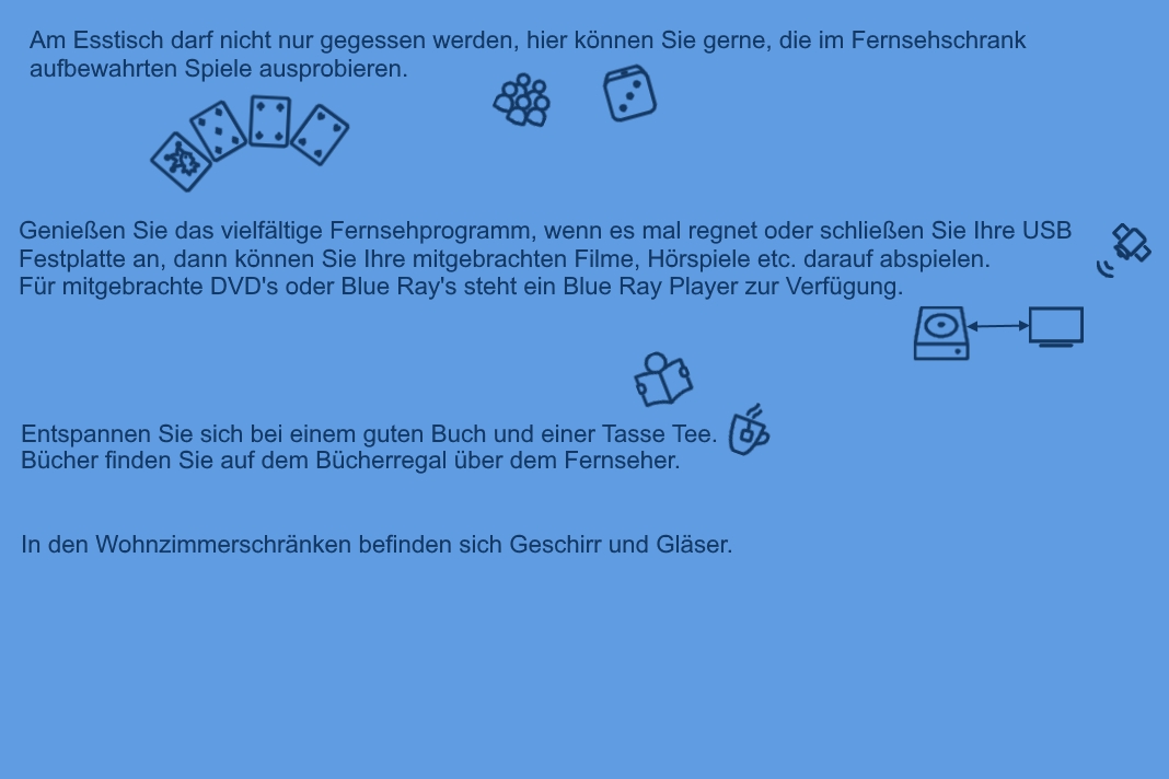 ist alles vorhanden. Im Abstellraum befinden sich ein Bügelbrett mit Bügeleisen und ein Staubsauger. Die Auflistung finden Sie im Inventarverzeichnis.