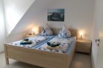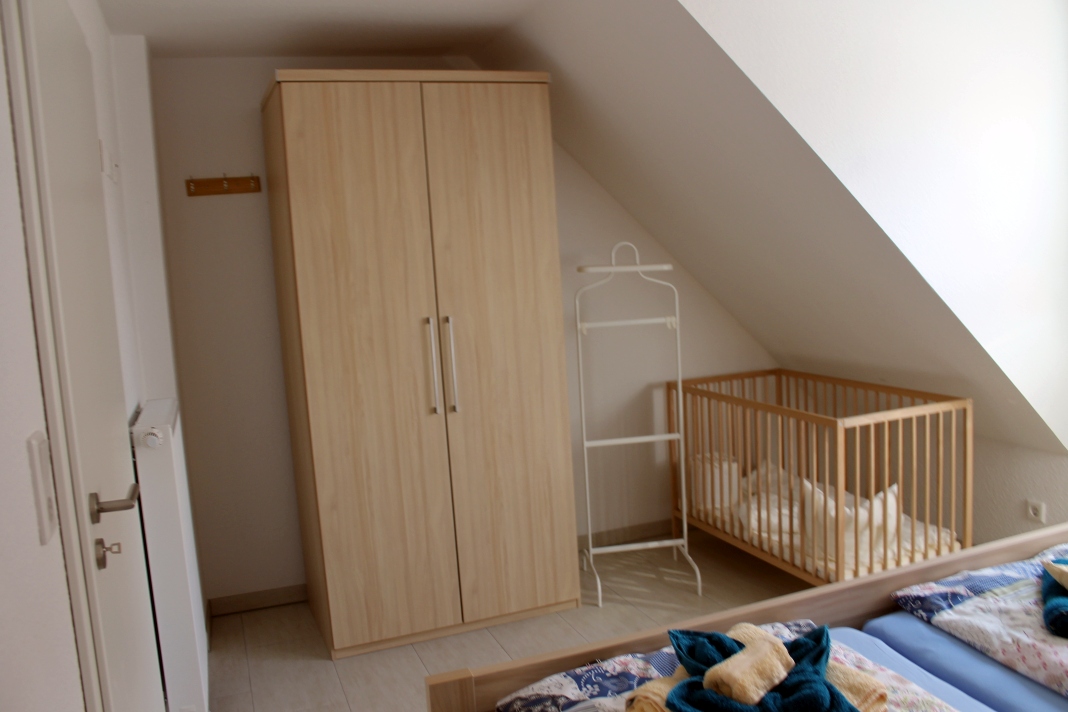 Links vom Treppenaufgang ist das Elternschlafzimmer. Hier befindet sich ein zusätzliches Kinderbett, das kostenfrei für ein Kind bis zu einem Alter von
